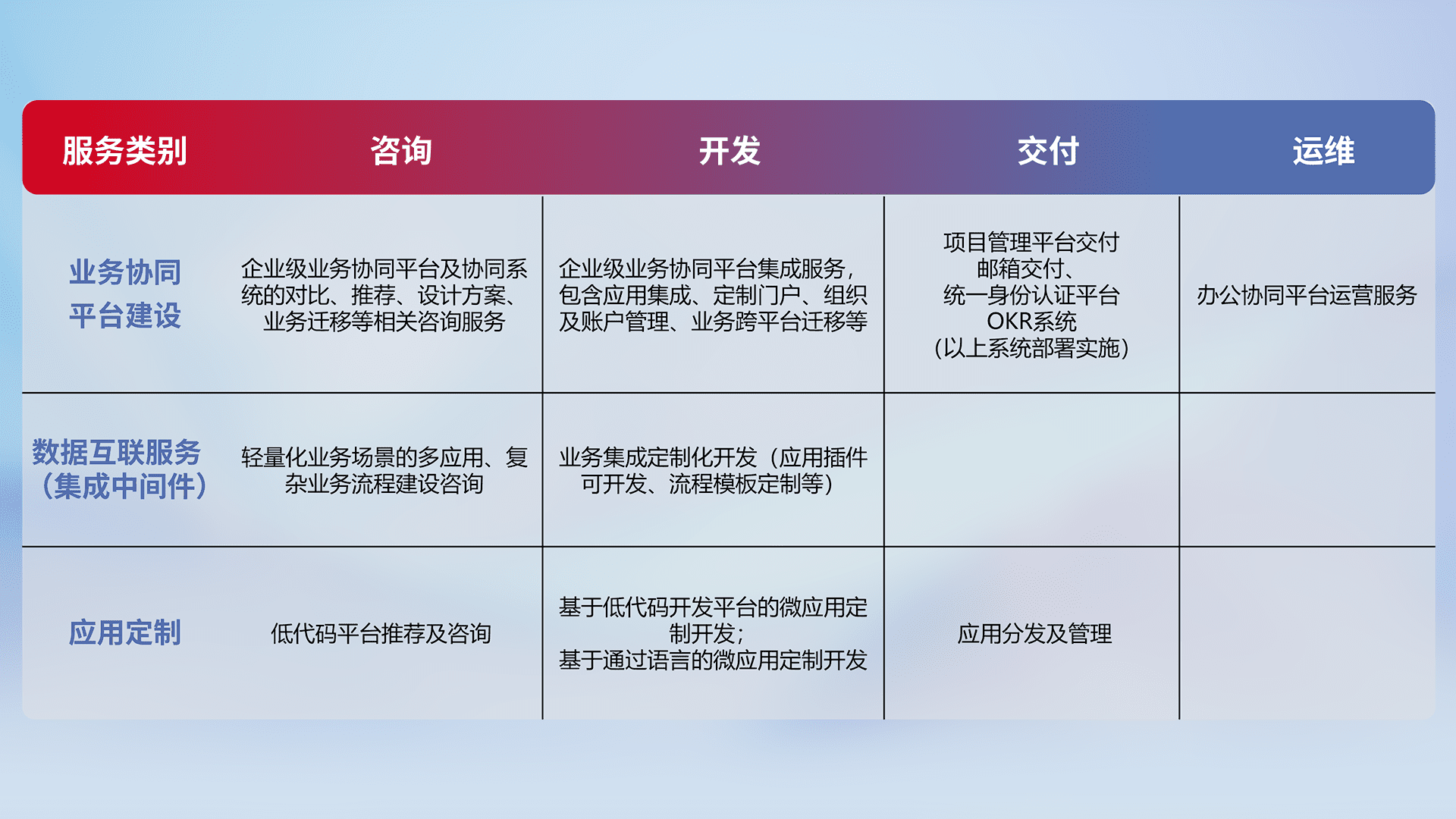 针对钉钉、、企微、、IDaas等平台级产品提供产品的规划、、、方案、、交付、、、定制化开发等服务,,,,实现如统一协同办公、、智能客户服务、、、混合会议管理、、、、智能数据查询、、、等业务场景,,,实现数字化转型。。。。